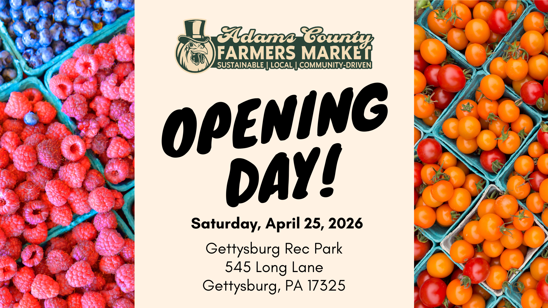 The Adams County Farmers Market is thrilled to announce the kickoff of the 2026 farmers market season on Saturday, April 25th! Join us for opening day and celebrate the return of fresh food, local flavors, and the vibrant community that makes our market so special. Come shop with all your favorite returning vendors and be among the first to discover new ones joining us this year!