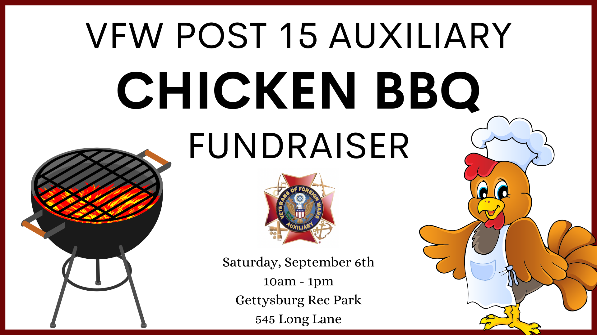 Get a delicious chicken barbecue lunch and help raise money for the local VFW! Proceeds go to help support veterans and the VFW Post 15 Auxiliary. For more information email brenda.mccabe22@gmail.com. You can also call Linda at 717-398-7119 or Donna at 570-971-7877 for pre-sale information. Chickens will be ready starting at 10am and extras will be available for sale while supplies last! Learn more about the VFW Post 15 Auxiliary HERE.